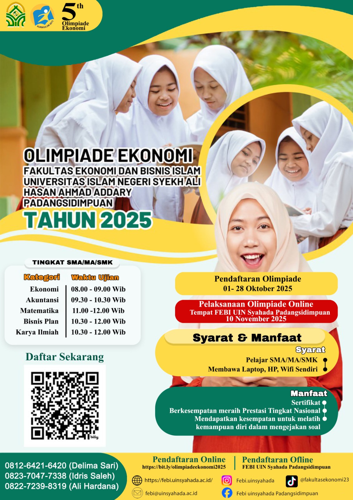 Fakultas Ekonomi dan Bisnis Islam UIN Syekh Ali Hasan Ahmad Addary Padangsidimpuan yang mengintegrasikan ilmu ekonomi modern dengan nilai-nilai Islam. Kami menawarkan 6 program studi unggulan: Ekonomi Syariah, Perbankan Syariah, Akuntansi Syariah, Manajemen Keuangan Syariah, Manajemen Bisnis Syariah, dan Bisnis Digital. Kami membekali mahasiswa dengan keahlian praktis, penguasaan teknologi, serta wawasan global untuk menjadi profesional yang kompeten, beretika, dan siap bersaing di era ekonomi digital dan industri halal.