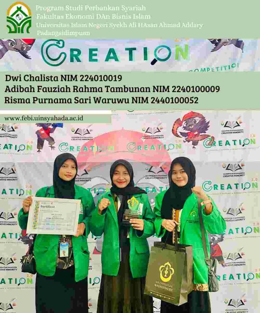 Padangsidimpuan, 30 September 2025 – Prestasi membanggakan kembali berhasil ditorehkan oleh mahasiswa Universitas Islam Negeri (UIN) Syekh Ali Hasan Ahmad Addary Padangsidimpuan. Tiga mahasiswa dari Program Studi Perbankan Syariah, Fakultas Ekonomi dan Bisnis Islam (FEBI), sukses meraih Juara 3 dalam ajang Creative Research National and International Competition yang berlangsung di Universitas Malikussaleh, Aceh, pada akhir September 2025.