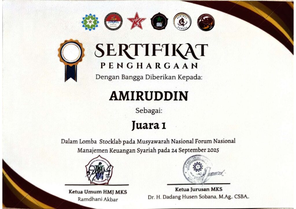 Sementara itu, pada cabang lomba Stocklab Amiruddin, menguji kecerdasan dan kecepatan dalam memahami dinamika pasar modal syariah melalui permainan edukatif berbasis simulasi, tim UIN SYAHADA tampil luar biasa dan konsisten unggul di setiap babak hingga meraih posisi juara pertama.