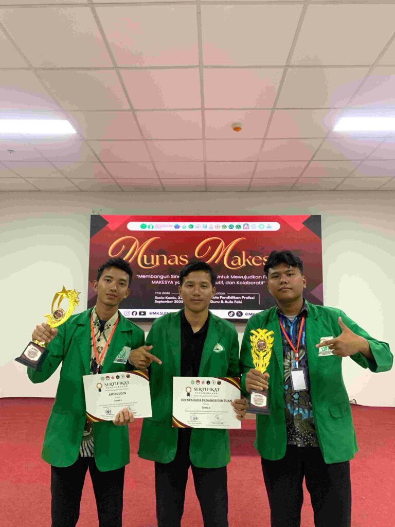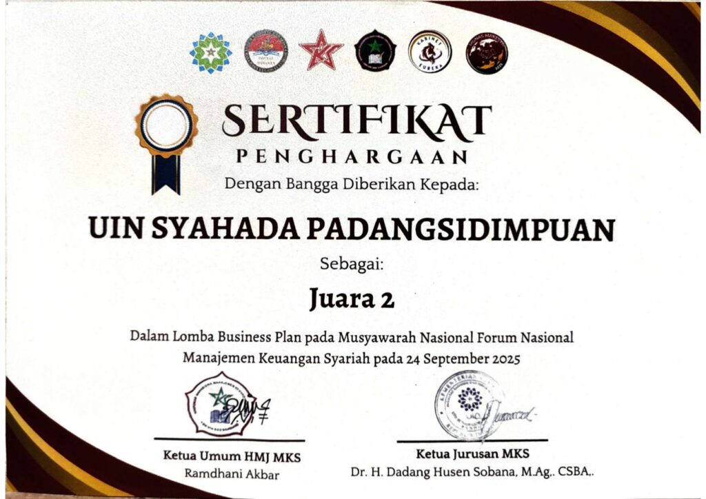 Padangsidimpuan, 30 September 2025 — Mahasiswa Program Studi Manajemen Keuangan Syariah Fakultas Ekonomi dan Bisnis Islam (FEBI) Universitas Islam Negeri Syekh Ali Hasan Ahmad Addary (UIN SYAHADA) Padangsidimpuan kembali mengharumkan nama kampus di kancah nasional. Dalam ajang Musyawarah Nasional Mahasiswa Keuangan Syariah (MUNAS MaKeSya) 2025 yang diselenggarakan di UIN Sunan Gunung Djati Bandung pada tanggal 24–28 September 2025, tim mahasiswa UIN SYAHADA berhasil meraih dua penghargaan bergengsi sekaligus.