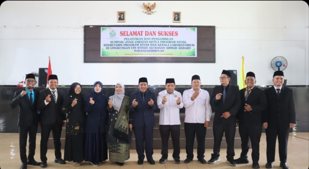 PADANGSIDIMPUAN 28/4/2026 – Estafet kepemimpinan di lingkungan Universitas Islam Negeri (UIN) Syekh Ali Hasan Ahmad Addary (Syahada) Padangsidimpuan kembali bergulir. Rektor UIN Syahada, Prof. Dr. H. Sumper Mulia Harahap, M.Ag., secara resmi melantik dan mengambil sumpah jabatan para Ketua Program Studi, Sekretaris Program Studi, dan Kepala Laboratorium di Auditorium Kampus, Selasa .
