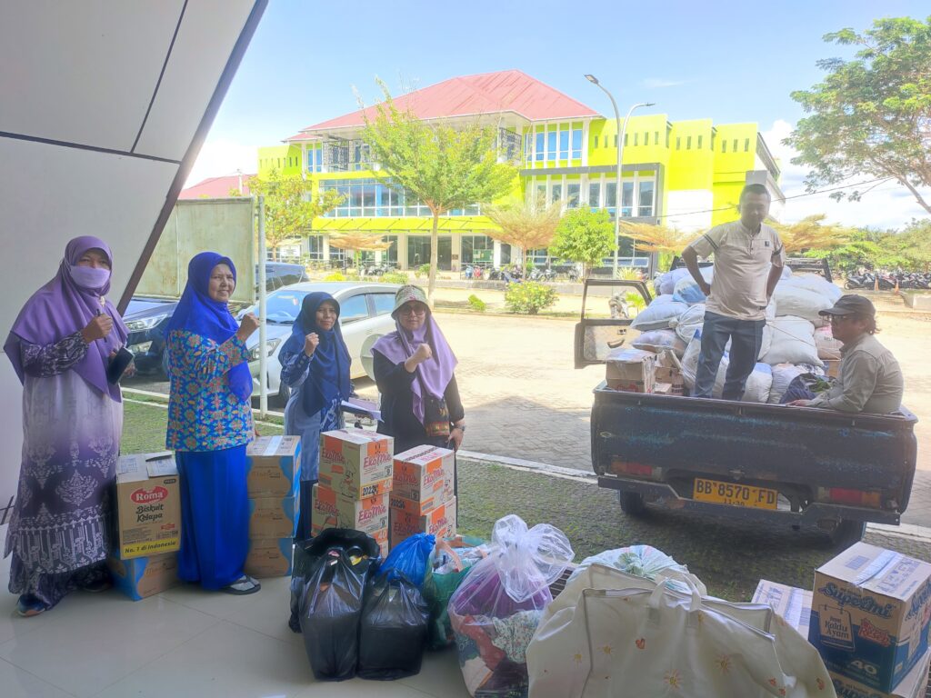 Kegiatan penyerahan bantuan ini diwakili langsung oleh Wakil Dekan II FEBI, Dr. Rukiah Lubis, M.Si, dan Wakil Dekan III, Dra. Replita, M.Si, serta didampingi staf dan jajaran fakultas. Bantuan yang disalurkan meliputi pakaian layak pakai, biskuit, air mineral, mie instan, serta sejumlah dana solidaritas yang dihimpun dari civitas akademika FEBI.