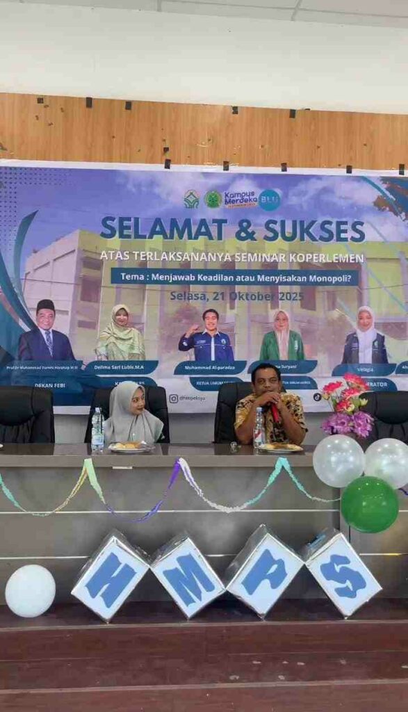 Padangsidimpuan, 21 Oktober 2025 – Himpunan Mahasiswa Program Studi (HMPS) Ekonomi Syariah Fakultas Ekonomi dan Bisnis Islam (FEBI) UIN Syahada Padangsidimpuan kembali menunjukkan komitmennya terhadap penguatan literasi ekonomi berbasis keadilan sosial melalui pelaksanaan Seminar Koperlemen (Koperasi Merah Putih di Tengah Lemah dan Lesunya Ekonomi Nasional) dengan tema besar “Menjawab Keadilan atau Menyisakan Monopoli.”